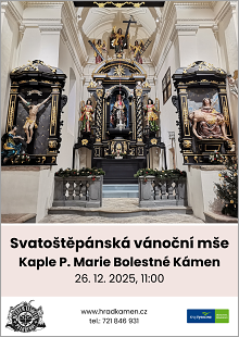 Muzeum Vysočiny Pelhřimov, p. o. srdečně zve veřejnost na Svatoštěpánskou vánoční mši, která se uskuteční v pátek 26. prosince 2025 od 11:00 hodin v kapli Panny Marie Bolestné v Kámeně. Mši svatou bude celebrovat duchovní správce Římskokatolické farnosti Věžná P. ThLic. Jaroslaw Ścieraszewski. Hudební doprovod na varhany zajistí pan Josef Kubů, který umocní slavnostní atmosféru druhého svátku vánočního.