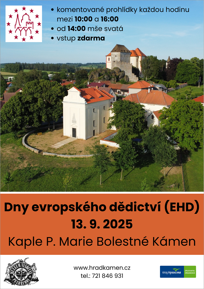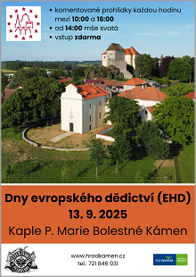 Srdečně vás zveme do kaple Panny Marie Bolestné v Kámeně, která se také v letošním roce zapojí do celoevropské akce Dny evropského dědictví (EHD). Jedná se o významnou kulturně poznávací společenskou událost, jež slouží k posílení historického povědomí v nejširších souvislostech se zvláštním důrazem na vnímání mezinárodního kontextu národního kulturního dědictví.