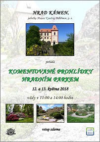 Komentované prohlídky po parku - květen 2016 Komentované prohlídky po hradním parku budou probíhat celý víkend, a to vždy od 11:00 a 14:00 hodin. Více než hektarový park hradu Kámen je pozoruhodný především svým skalním útvarem ze serpentinitu. Záhřevná skála a zbytky hradního opevnění vytváří vhodné podmínky pro růst širokého spektra rostlin, včetně některých citlivějších, jakými jsou například magnólie či cesmína. Velkou zajímavostí je také alpinum, které se právě v květnu zahalí do mnoha barev rozkvetlých skalniček. V parku nechybí ani vzrostlé stromy, keře a okrasné jezírko. Prohlídky budou zaměřeny jak na historii, současnost a dokončenou revitalizaci parku, tak i na jeho flóru a faunu, neboť je park domovem mnoha živočichů. Hradní park bude otevřen od 10:00 do 17:00 hodin.